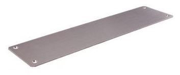 The 216 Series Door Furniture is 300 x 65 x 2mm thick stainless steel or brass plate with 10mm radius corners. Concealed fixed plates have studs with internal threads located in each corner, visible plates have corresponding countersunk holes and are fixed back to back through the door.