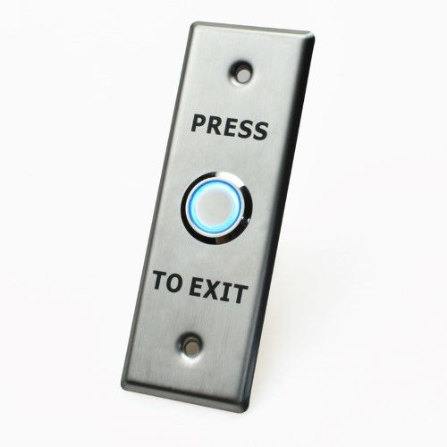 X2 illuminated mechanical push to exit button, with blue LED backlighting. Elegantly styled and mounted on a high quality 304 stainless steel panel.
